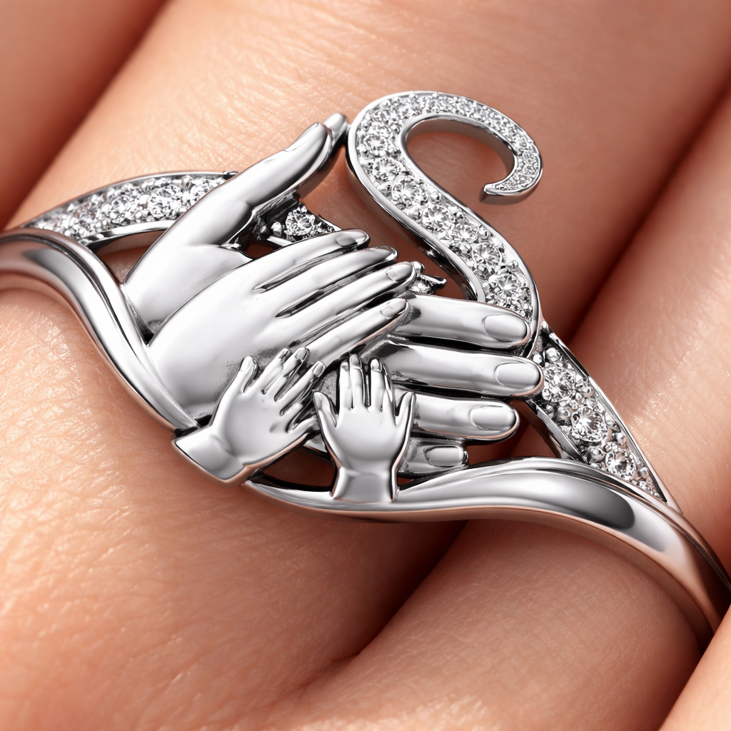 A women's ring. Anillo de plata con la mano de papa, mamá, dos manos pequeñas y una letra S atras, modern style