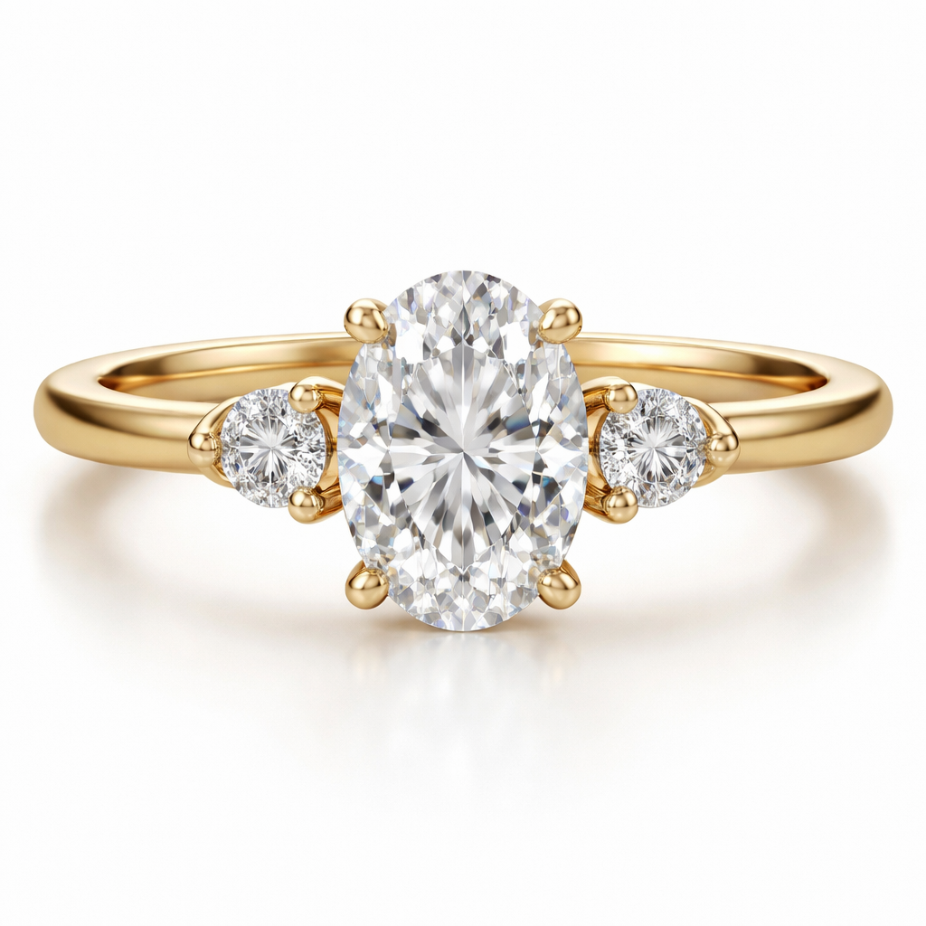 Create a wedding ring. I want the band gold and I have two .25 diamond earrings I want shaped on the side and a middle diamond that is oval shaped