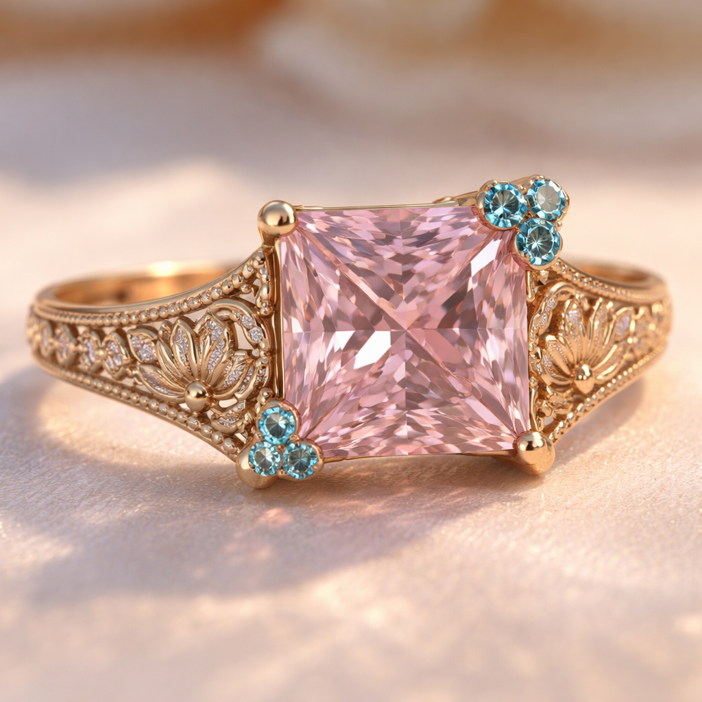 a light pink princess cut 4ct diamond ring with two small 0.25ct blue diamonds on the top right of the main light pink diamond and a small 0.25ct blue diamond on the corner of the bottom left of the main diamond with lotuses engraved on a gold band, bohemian style
