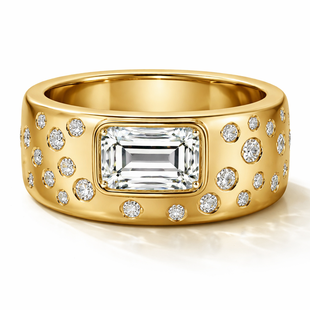 Thick gold band with one carat emerald cut diamond set horizontally with 20 small round diamonds scattered