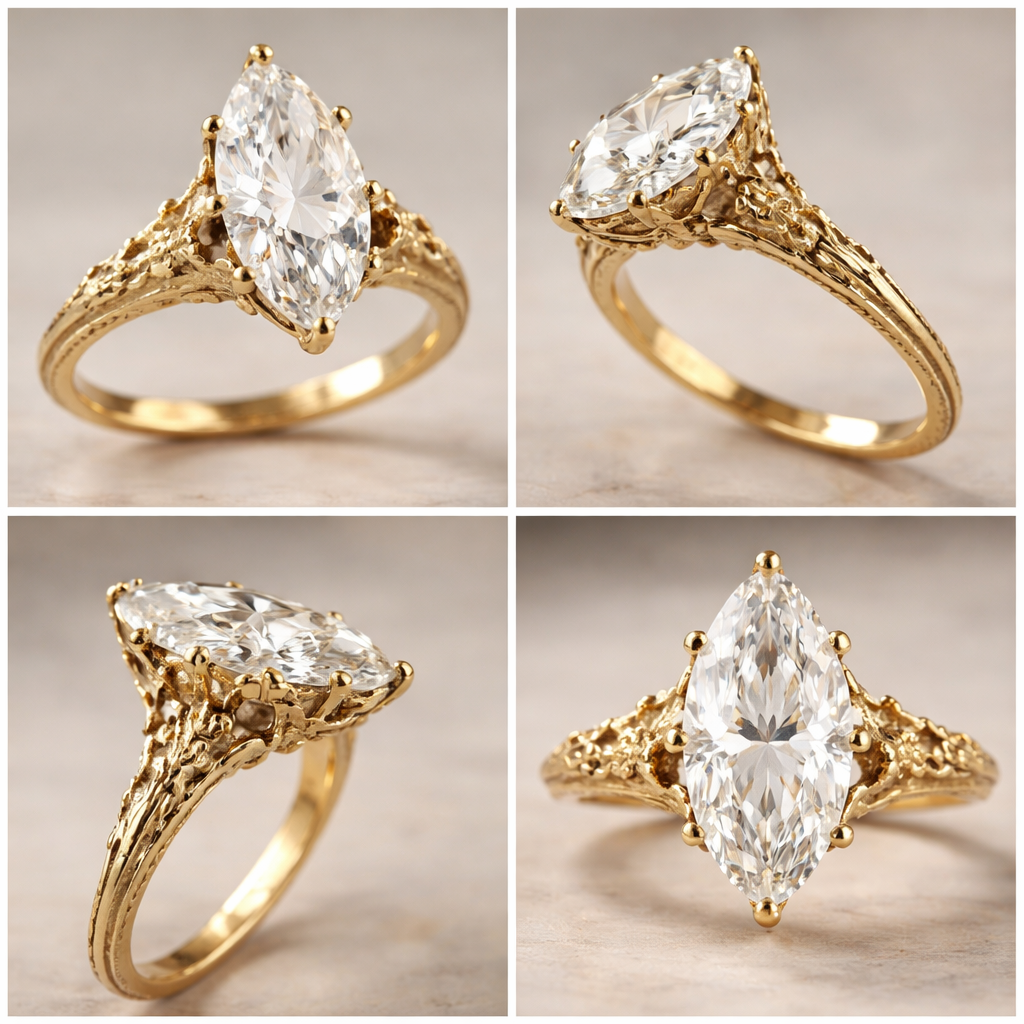 4 carat marquise solitaire ring, high setting, with 6 prongs, yellow gold, and create a view from different angles , georgian style