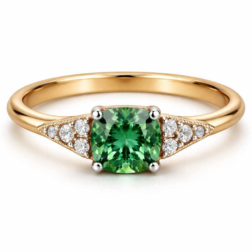A yellow gold 18 carat very thin band with a sharp angled edge ring. Central green sapphire in a cushion cut. Either side of the central sapphire are three very small diamonds on each side in a triangle formation with a bevelled edge border. The profile of the stones are raised in profile to accommodate a round wedding band underneath. All stones are held in place by platinum prongs.