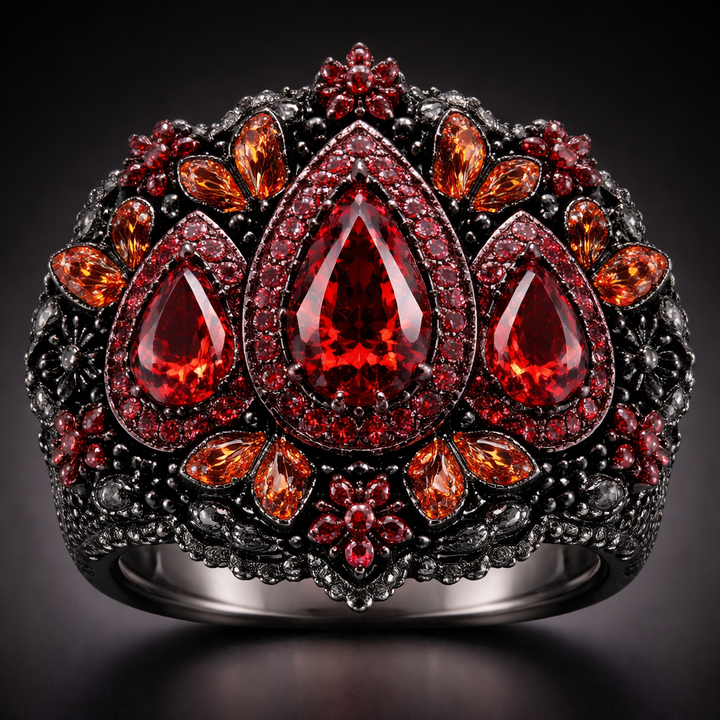 A ring with 3 teardrop shaped red diamonds and thousands of red gems surrounding with hundreds of butterfly shaped dark blood orange gems surrounding those gems and even more black gems surrounding those butterfly gems with even more tiny flower shaped red gem surrounding those black gems with more dark grey gems surrounding those flower gems, fantasy style