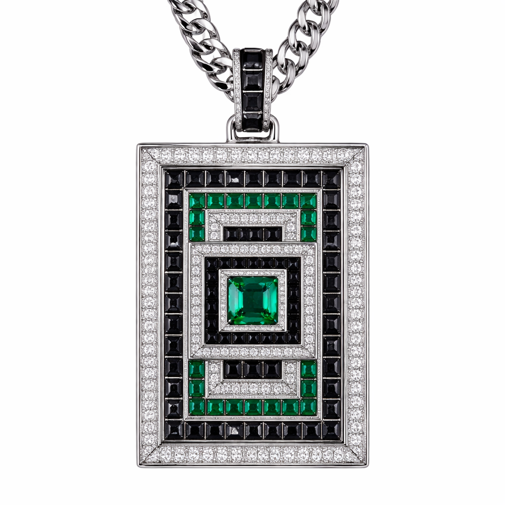Geomatric pendant and chainfor men of rectangular and sqaure shape of white and blcak diamonds and green of unique design and special shape