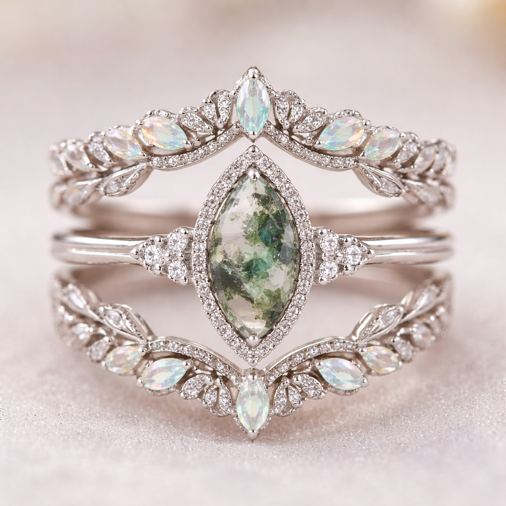 Thin Marqué cut moss agate with mini diamond halo, on thin white gold band with 3 small diamonds on each side in triangular pattern. Wedding enhancer band with leaf crown with opal and diamonds. Enhancer band on top and bottom of the engagement ring