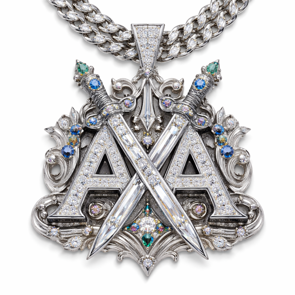The style generally consists of thick, wide, 14k-18k white or rose gold Cuban links completely flooded with VVS natural diamonds. The pendant features a "one-of-a-kind" design with a mix of diamonds VVS and Baguette diamonds . It also features unique pyramid-cut jewels and an elevated structure. The Chain (Cuban Link): It is a custom, heavy-duty Cuban link chain made of white gold. The links are exceptionally large and entirely "iced out" (covered) with VVS diamonds.2 A’s With Crossed Swords But The 2 A’s Separate the 2 swords Are with the sword tip upwards but crossing , art_nouveau style