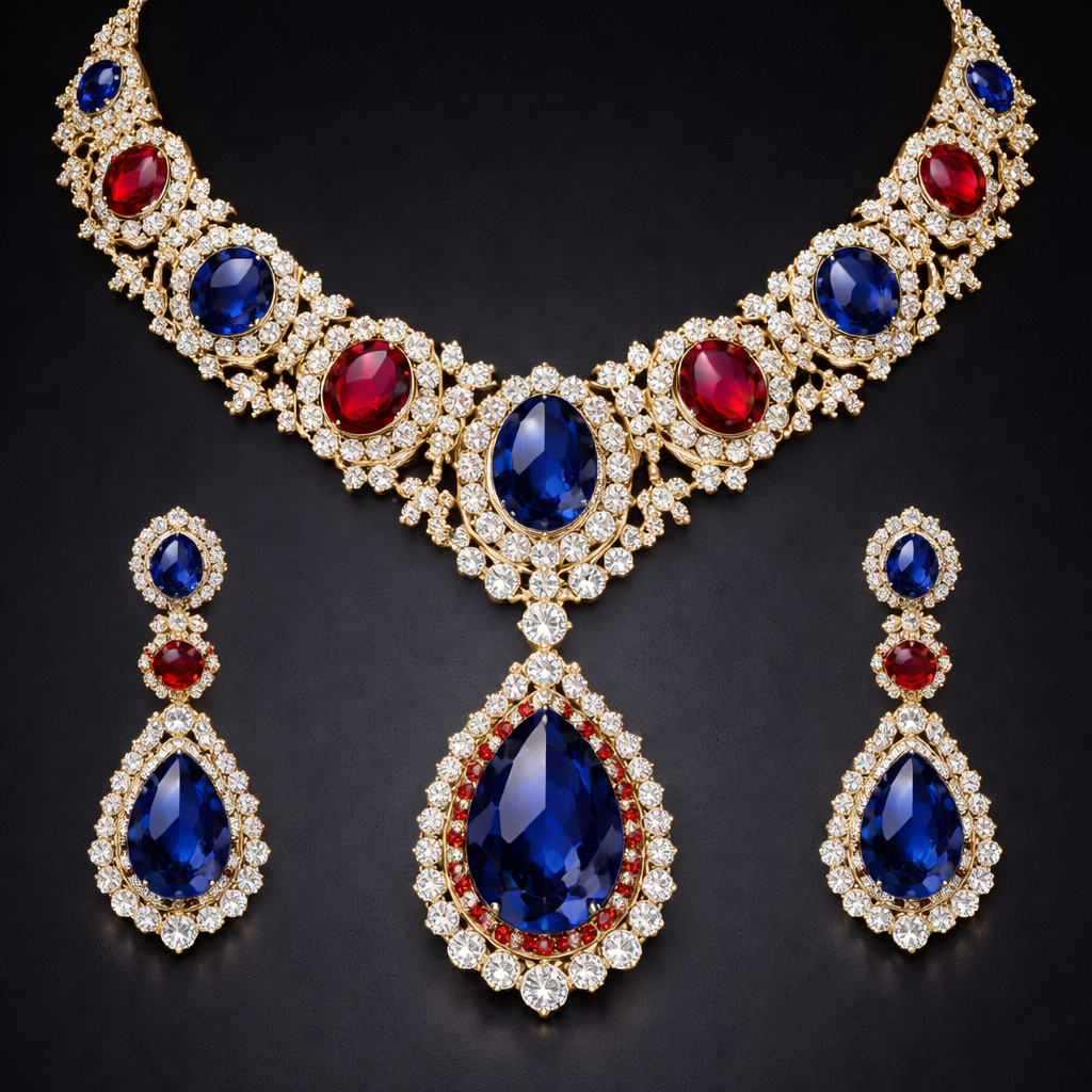 Ouro , pedras azuis e vermelhas com detalhe de brilhantes em volta , royal style
