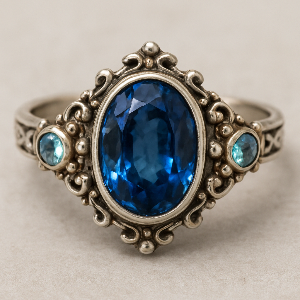 Oval sapphire silver ring with round aqua topaz accent stones , georgian style