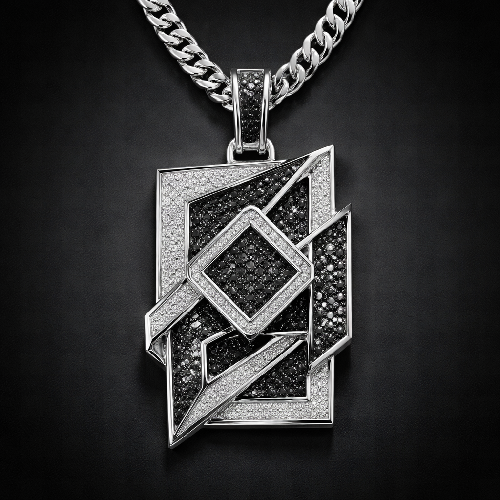 Geomatric edgy angles pendant and chainfor men of rectangular and sqaure shape of white and blcak diamonds of unique design and special shape