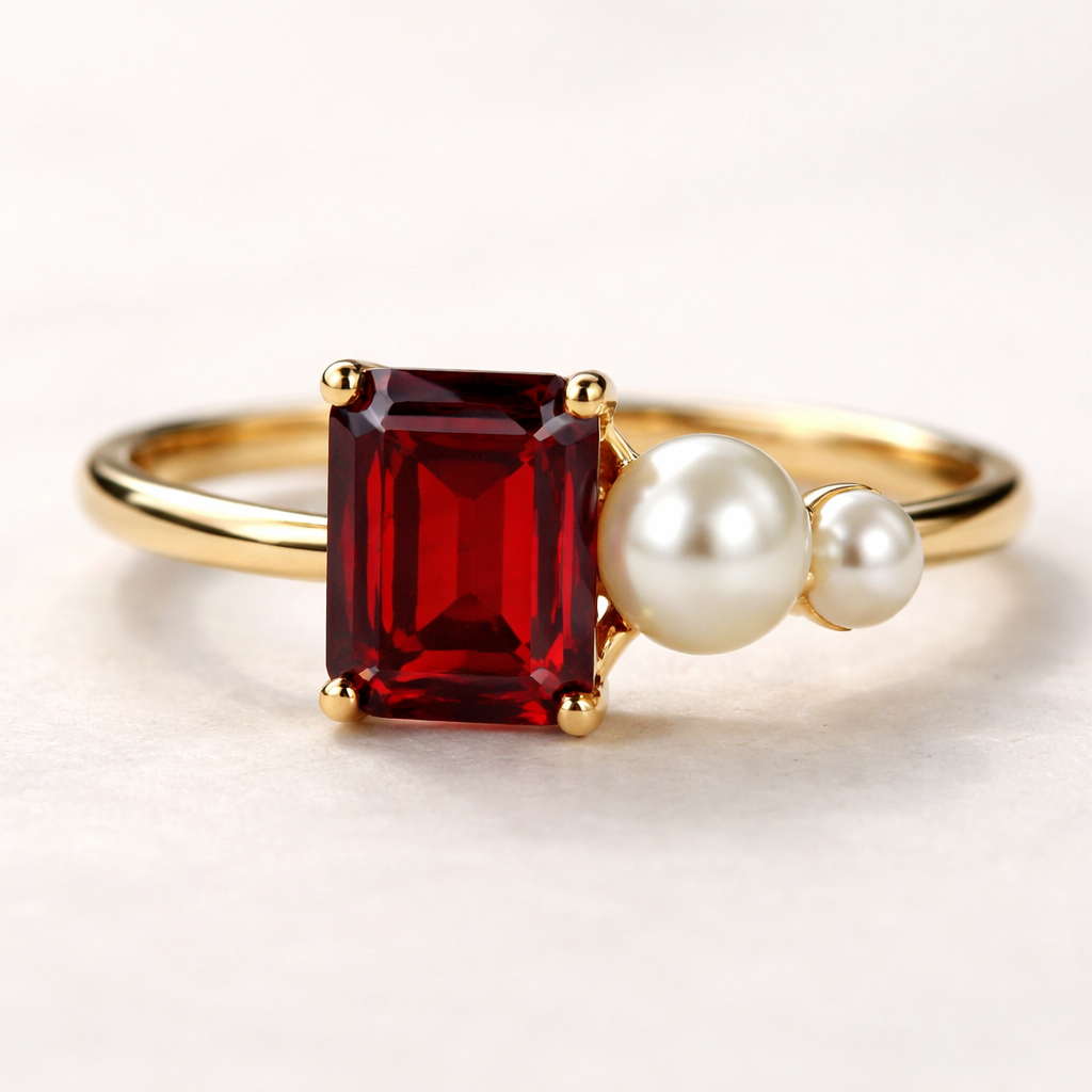 Rectangle garnet set in gold ring with two pearls on one side