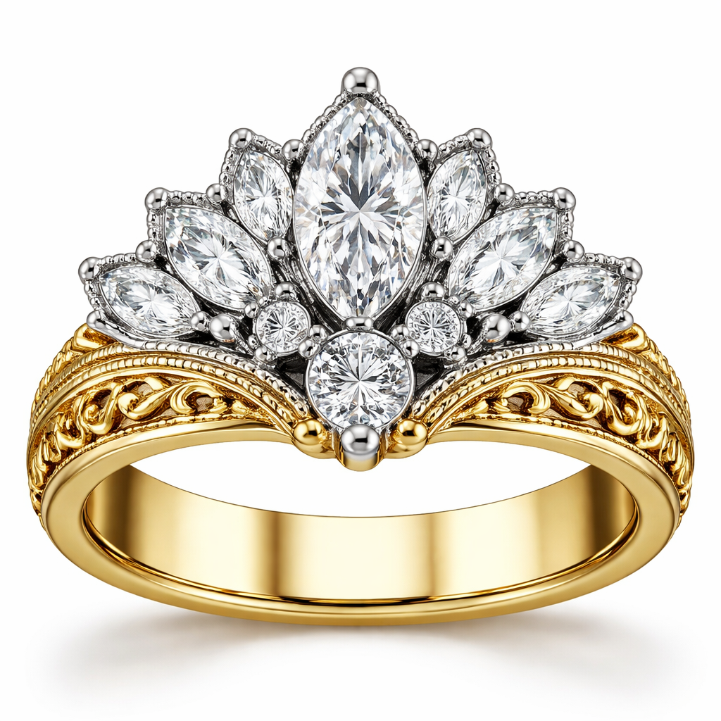 Create a ring in 14k yellow gold, set in platinum. The center stone is a .60 size marquise diamond with a .25 round diamond set directly under the marquise. Add 6 more marquise shaped diamonds and 2 more round diamonds in the shape of a fan with a thick gold yellow gold band , baroque style