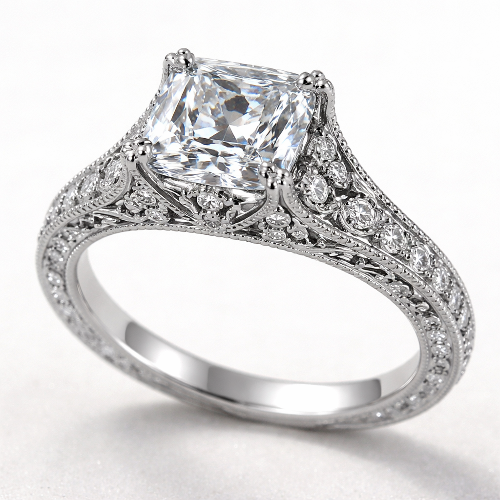 I want a ascher cut diamond ring with diamond accents on the band with a crown cathedral , vintage style