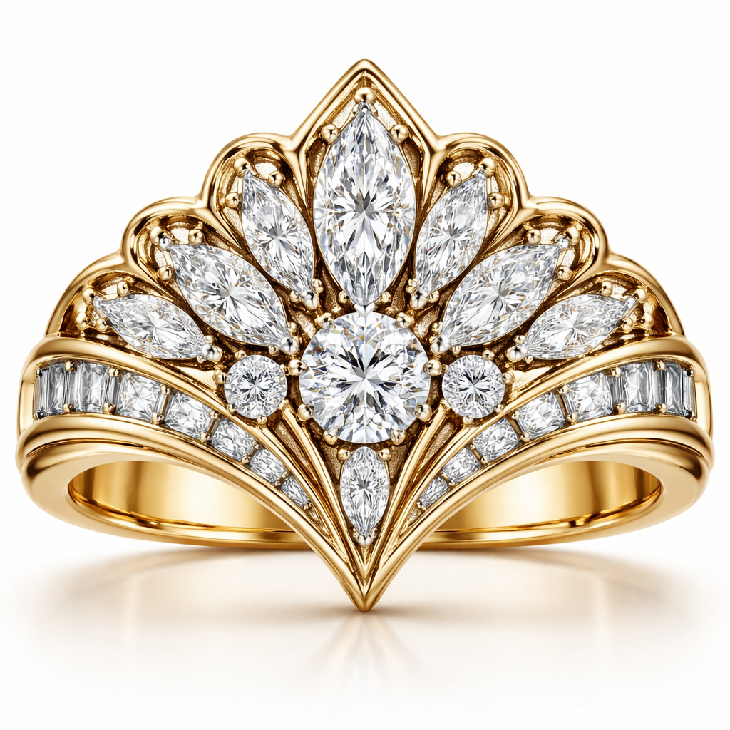 .6 karat marquise centered, with .25 round directly under it with 6 more smaller marquise diamonds and 2 .15 round diamonds mounted on a wide 14k yellow gold band. Make the design in a fan shape and use platinum prongs add some baguette diamonds also this is the exact size of the 6 smaller marquise stones and the baguette stones Center round cut Diamond measures 4mm +- 0.25ct 2 x +- 5mm x 2.5mm marquise diamonds +- 0.13ct each 1 x +-4.5mm x 2.5mm marquise diamond +- 0.11ct 1 x +-3.5mm x 2mm +- 0.07ct 2 x +- 4mm x 2mm +- 0.10ct each 8 x +- 2mm x 1.5mm +- 0.02ct each, art_nouveau style