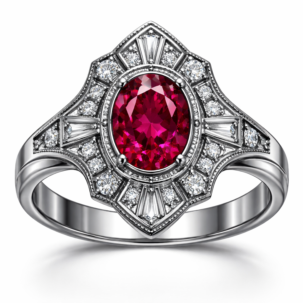 Stainless steel ring with a a beautiful shining ruby in the middle, art_deco style