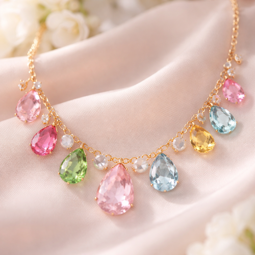Gem stone necklace on a gold chain. Gem stones are different shapes and colors are light pink, hot pink, green, light bl...