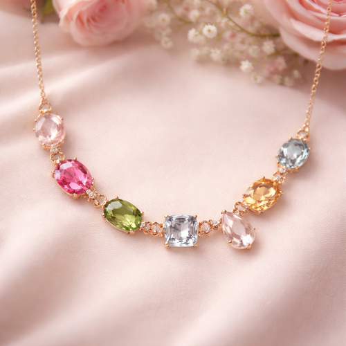 Gold prong set Gemstone necklace. Gems are different sizes and the colors are light pink, hot pink, blue, light green, a...