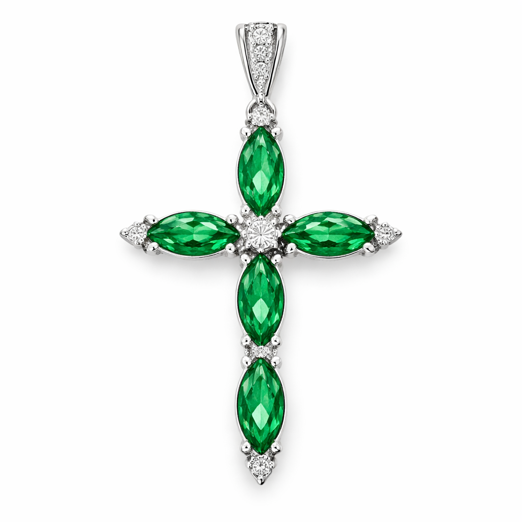 Marquise cut emerald white gold cross with a few diamonds accents