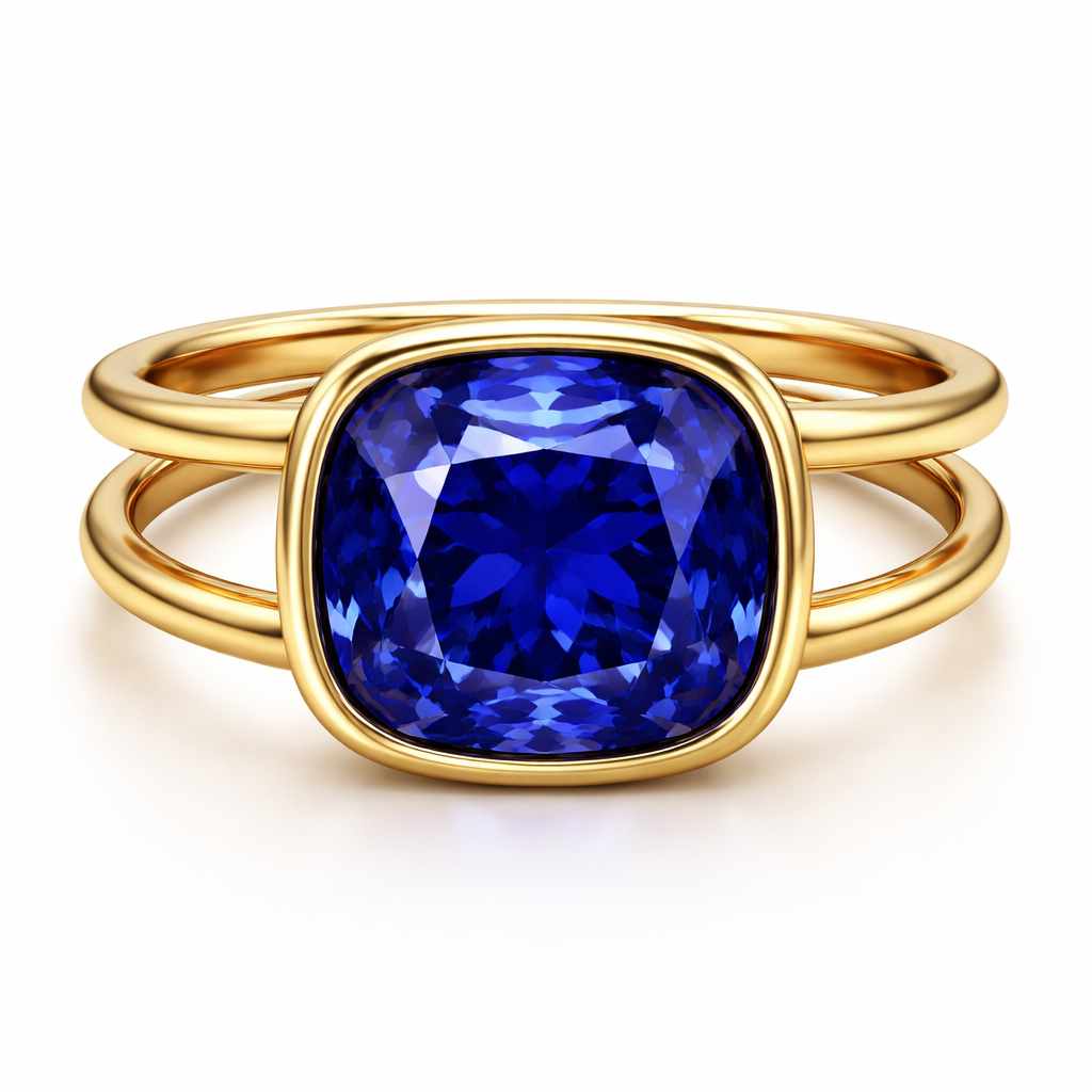 Sapphire 3,28 carat royal blue cushion. Need ring without any additional stones but something not classic. Yellow gold. Not too much gold. Stone between two lines of gold and thin gold around the stone like a stone inside gold