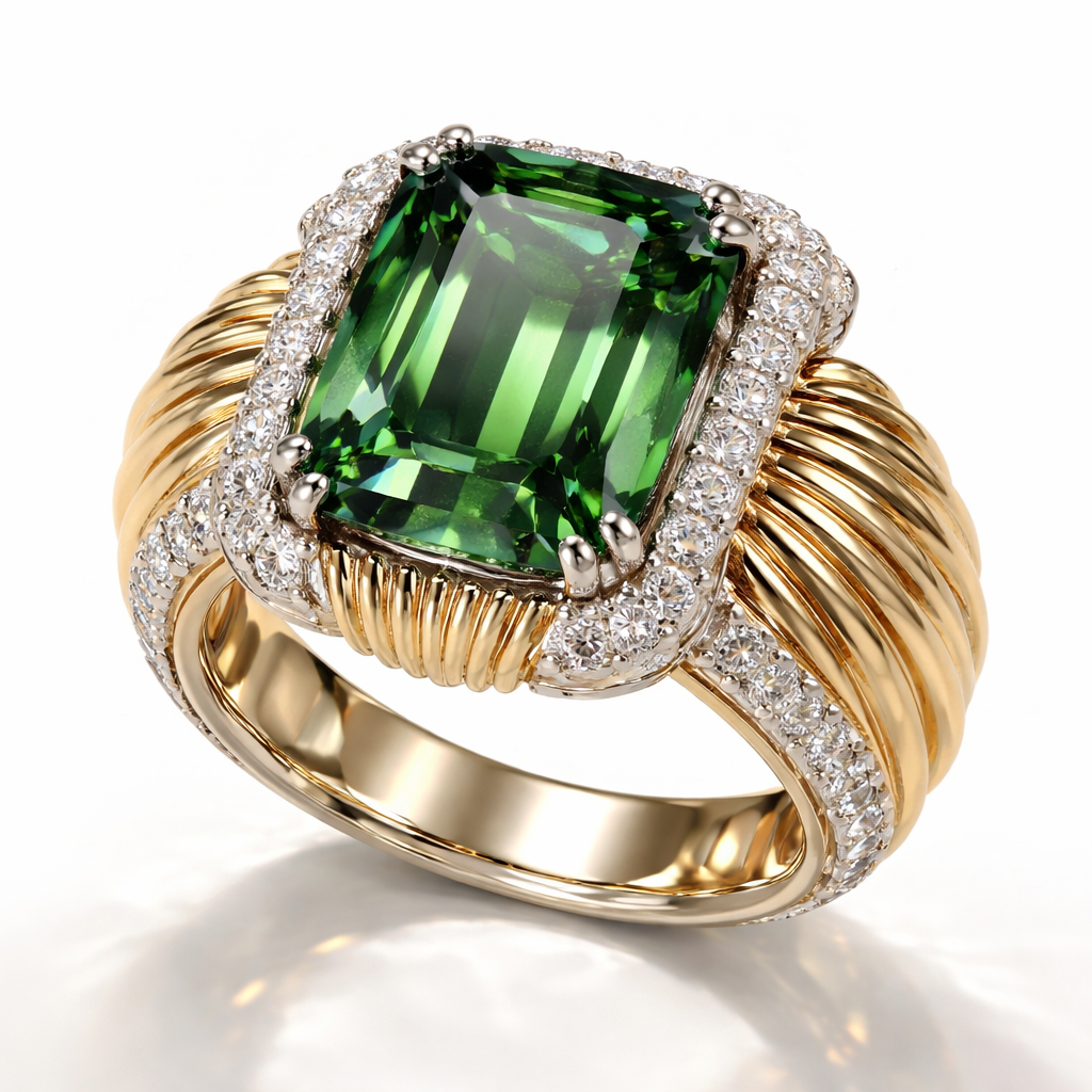 Thick gold band with one carat emerald cut diamond set horizontally with 20 small round diamonds scattered