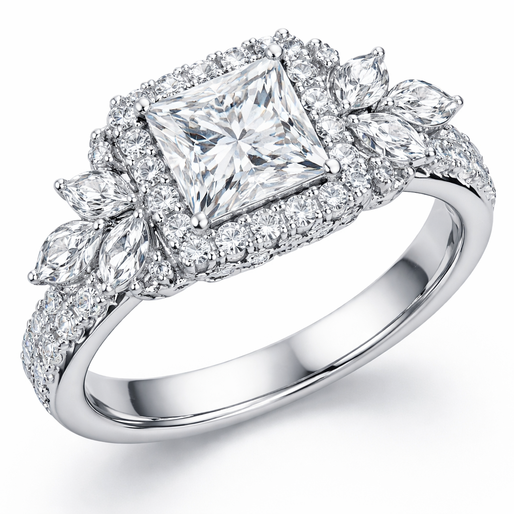 Solid white gold band with 1ct princess cut diamond. The halo has 3 marquise diamonds on either side and the rest of the halo is round diamonds. , royal style