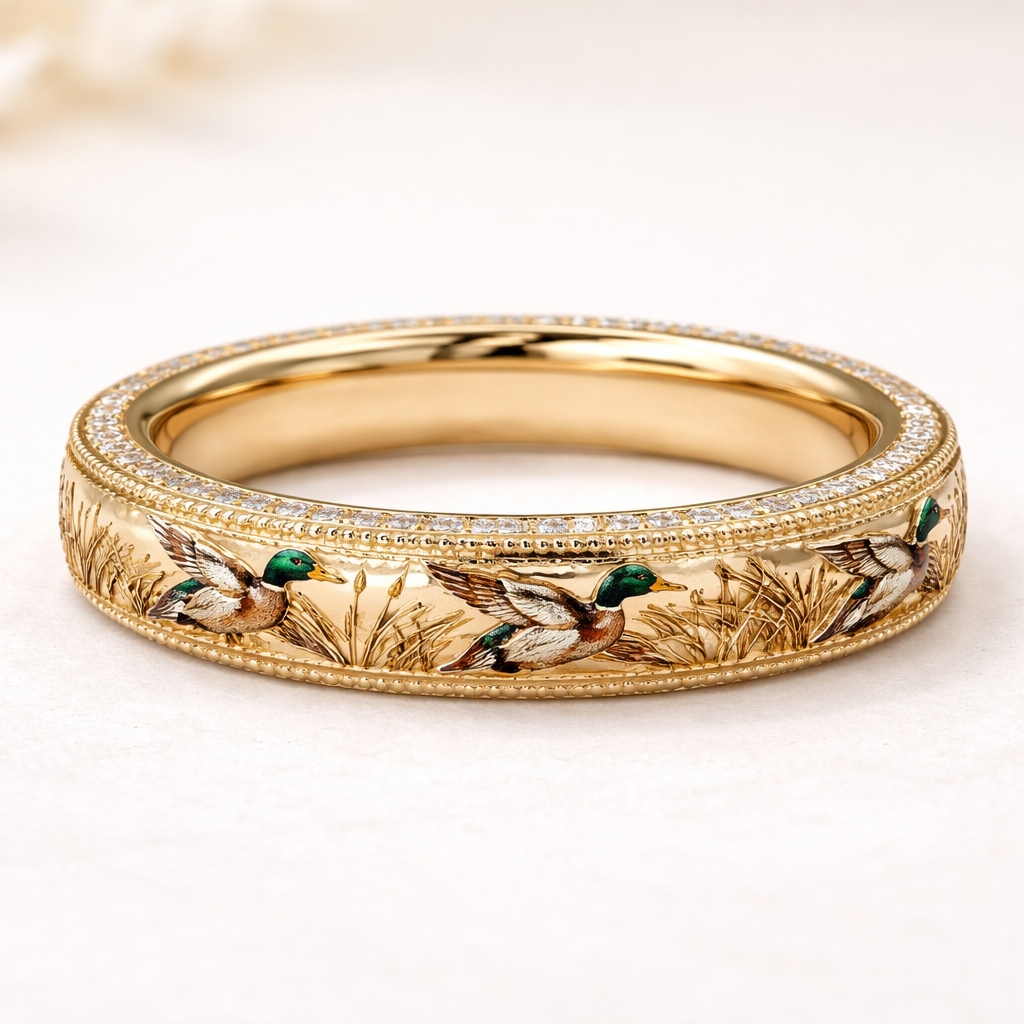 Skinny Eternity band with engraved mallard ducks gold diamonds, nature_inspired style