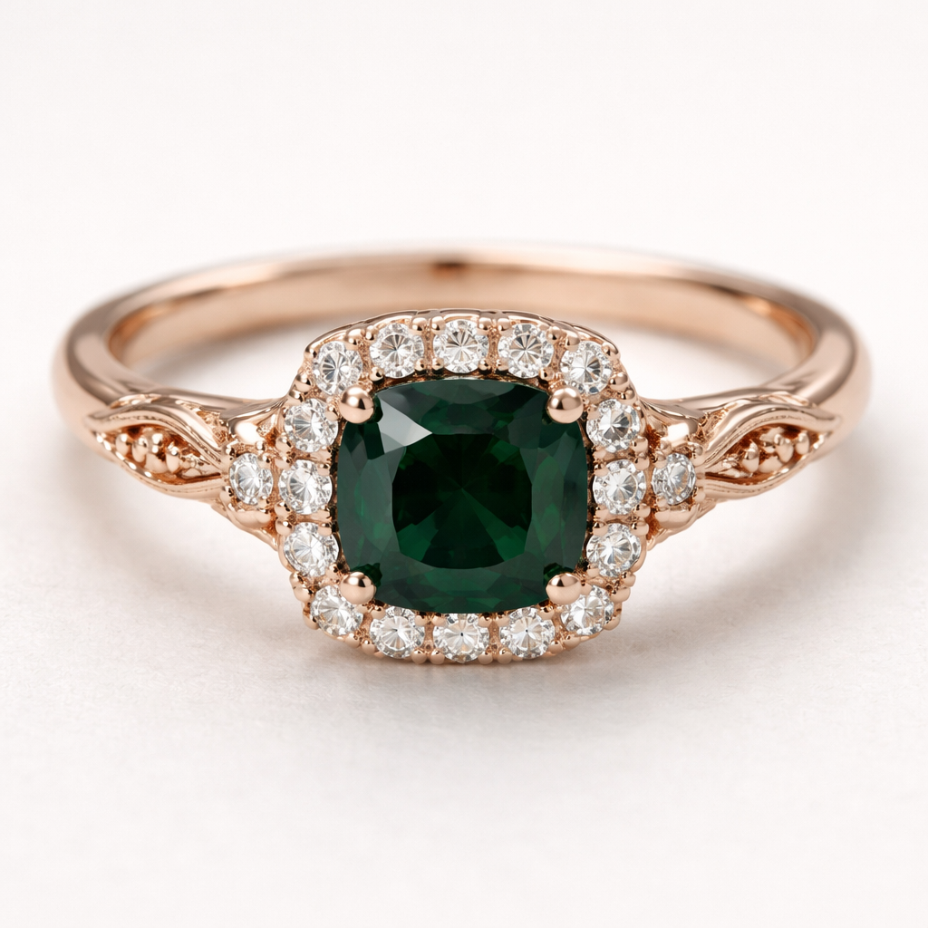 A ring with a dark green gem in the middle and lots of diamonds surrounding it with rose gold carvings, minimalist style