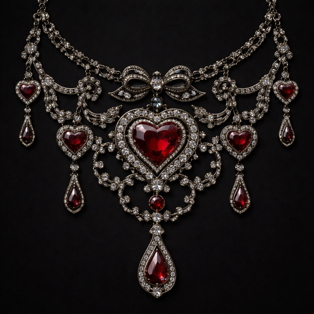 Dissemble for unconditional love with black diamonds and red rubies on a chain for necklace and see what it looks like, victorian style