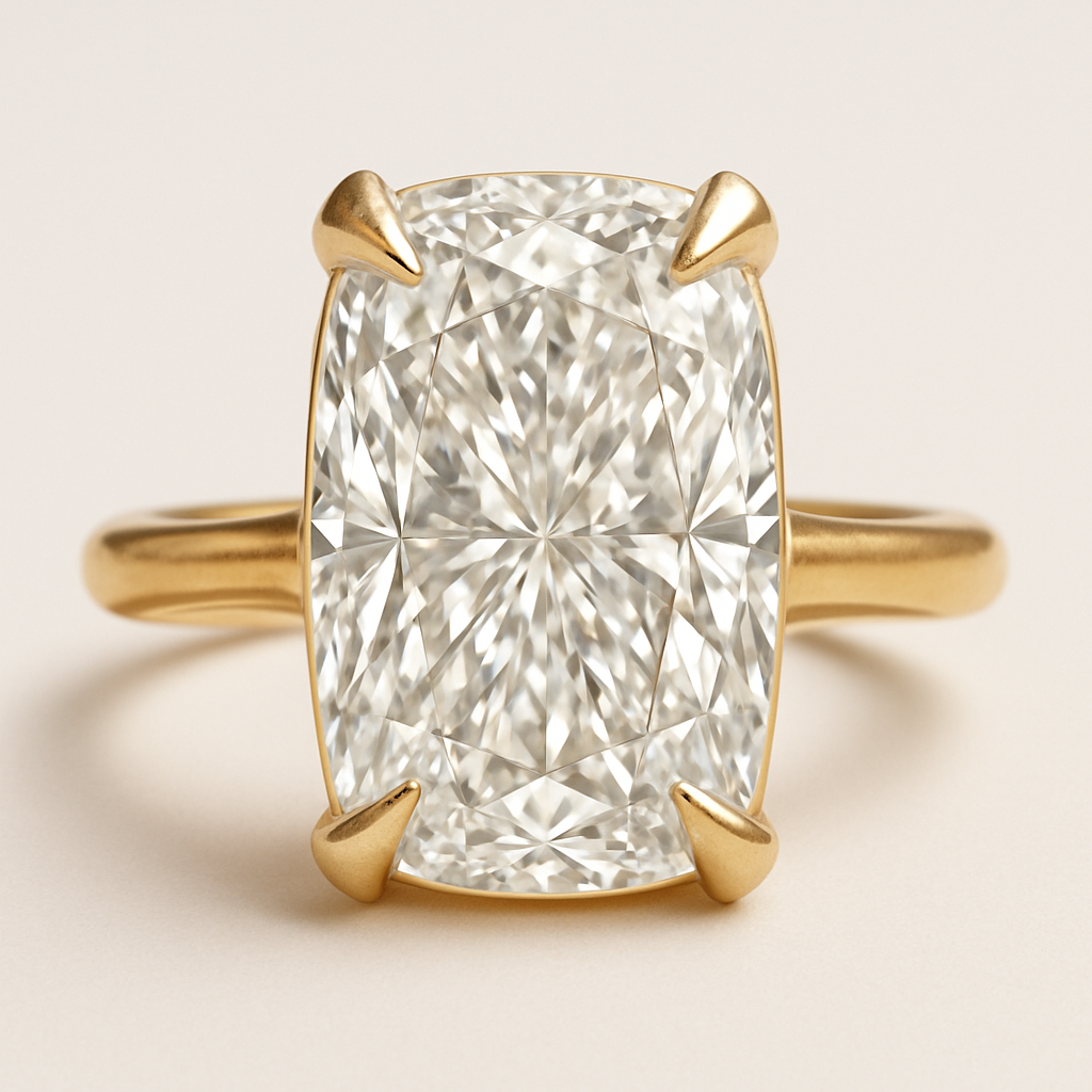 Elongated cushion diamond in yellow gold with Talon prongs at north south east and west Talon prongs, cameo style