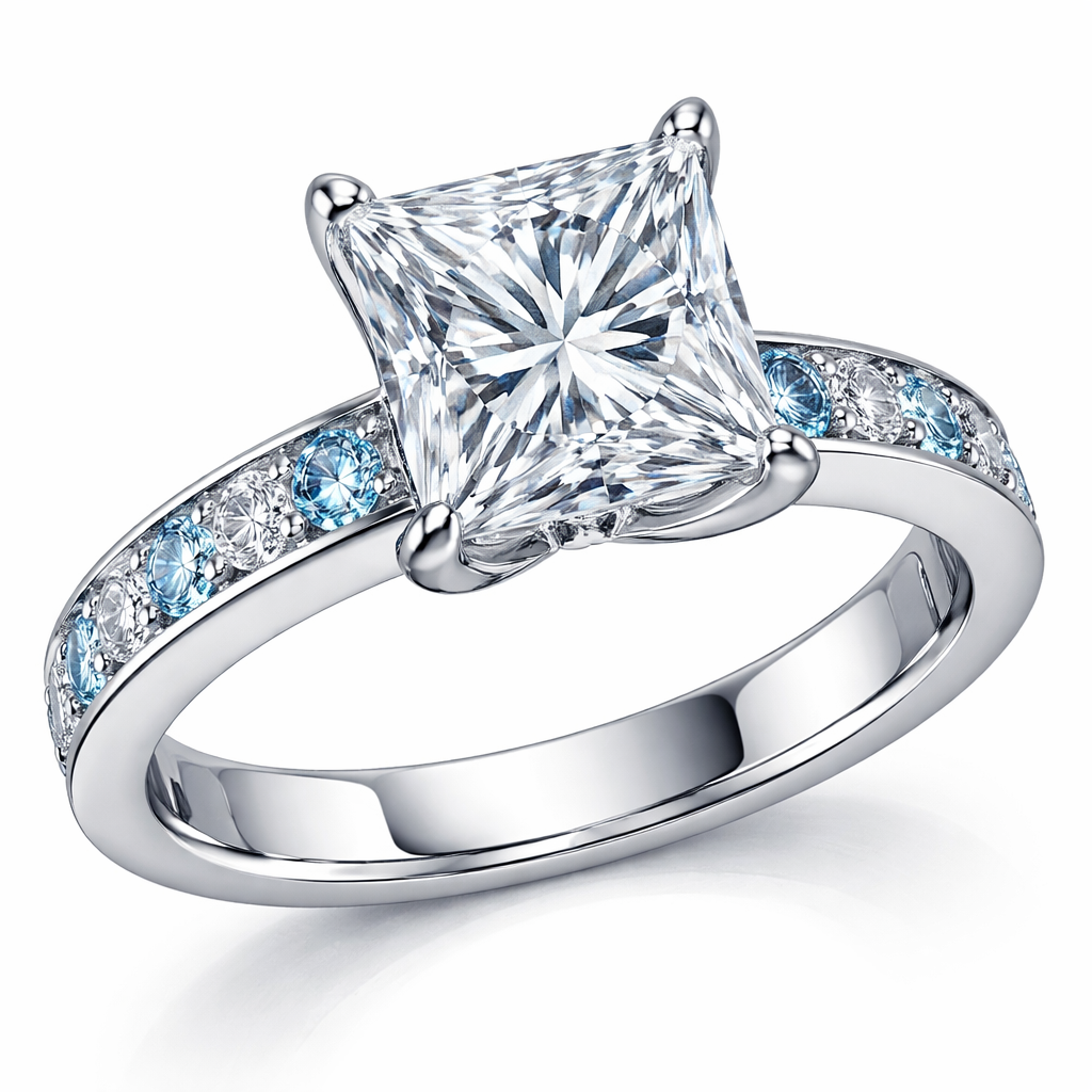 3ct solitaire princess diamond with channel set band with diamonds and aquamarine