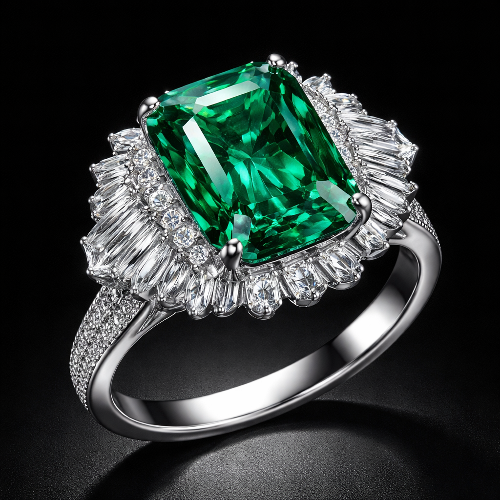 Luxury emerald ring, high jewelry photography, black background, dramatic lighting, ultra realistic, modern style