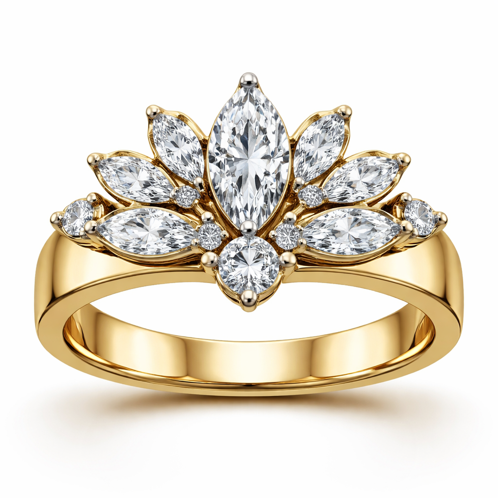 .6 karat marquise centered, with .25 round directly under it with 6 more smaller marquise diamonds and 2 .15 round diamonds mounted on a wide 14k yellow gold band. Make the design in a fan shape and use platinum prongs