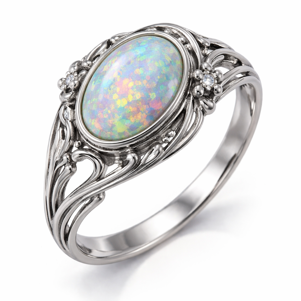 Oval opal bezel set silver ring , art_nouveau style