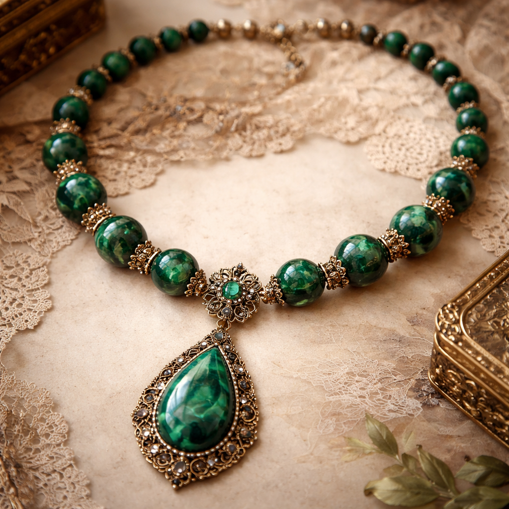 Design a necklace using malachite beads , vintage style