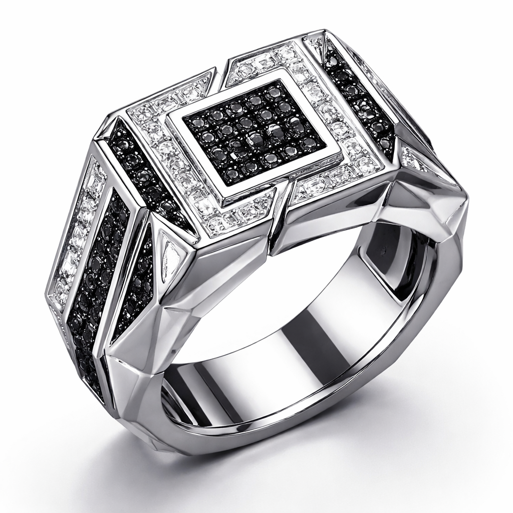 Geomatric sharp angles edgy angles ring for men of rectangular and sqaure shape of white and blcak diamonds of unique design and special shape