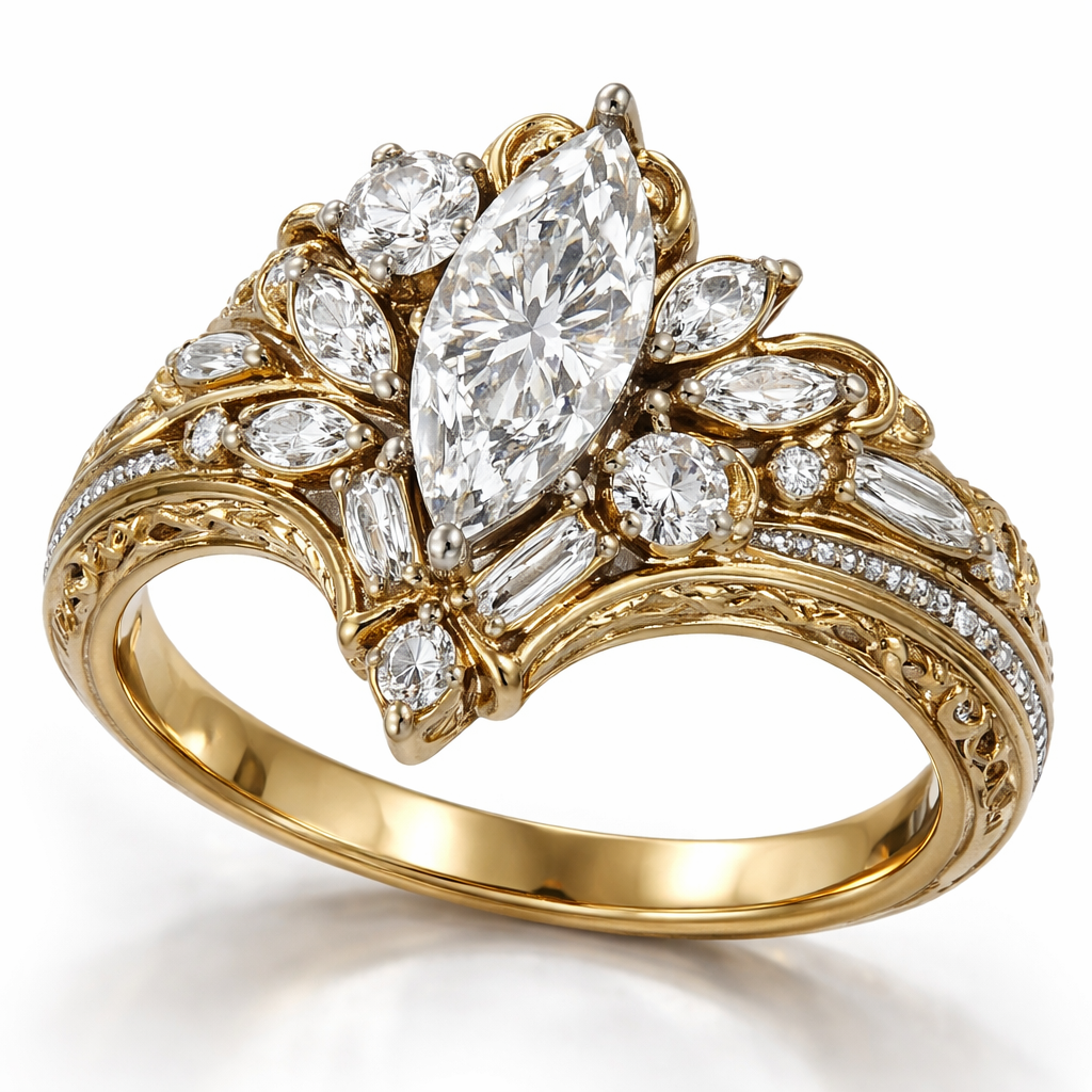 Asymmetrical diamond ring design with 1 .6 marquise , 1 .25 round , 6 smaller marquise, 2 .15 round and 4 .1 baguettes on a yellow gold band set in platinum , renaissance style