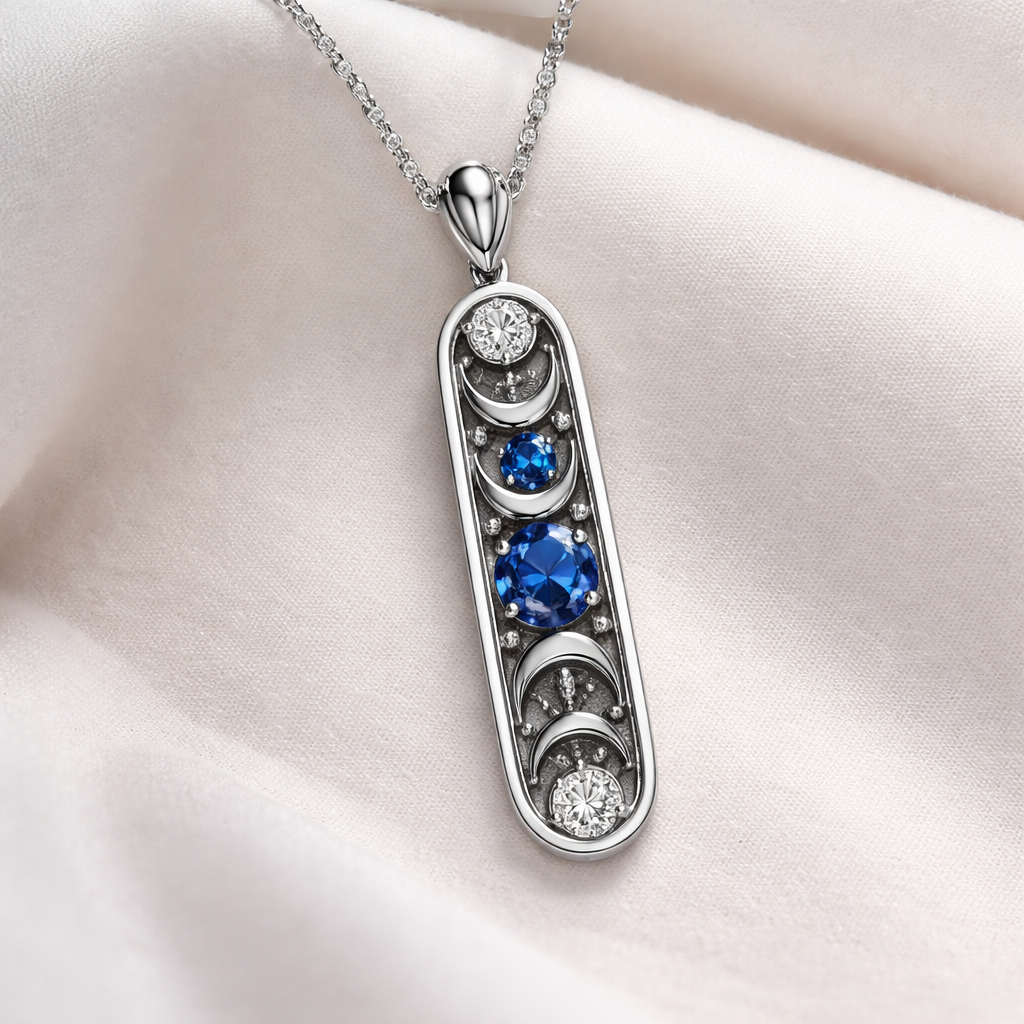 A women's pendant made of silver with diamond and sapphire stones suitable for daily wear. pingente fases da lua, modern style