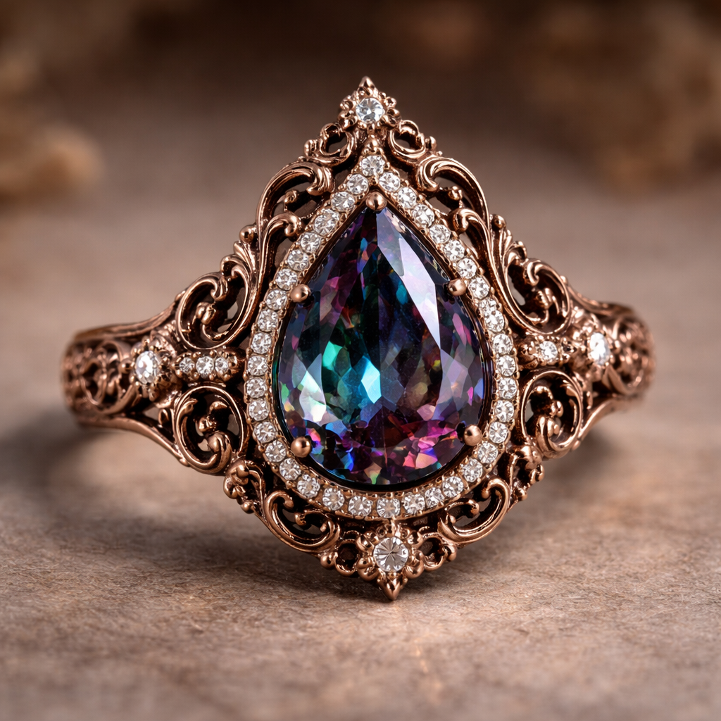 A ring with a teardrop shaped alexandrite gem with an intricate dark rose gold design surrounding the gem, victorian style