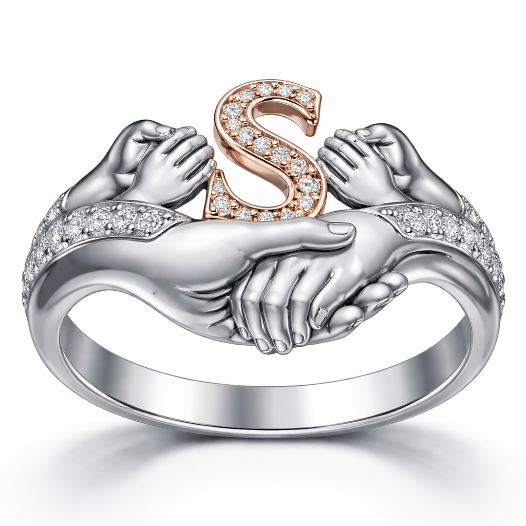 A women's ring. Anillo con una mano sujetando una mano y 2 manos pequeñas con una letra S atras, modern style