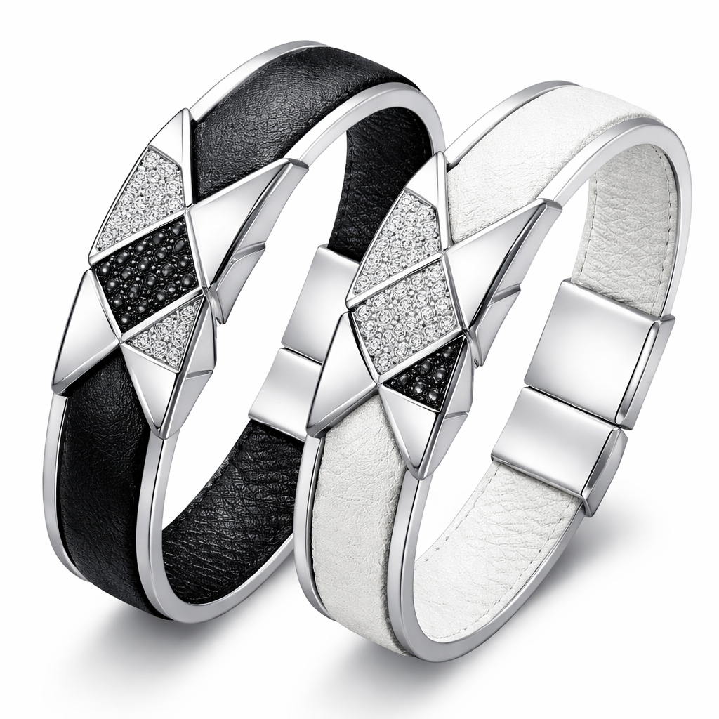 Geomatric abstract shape of bangle leather of matching for couple white and black diamonds