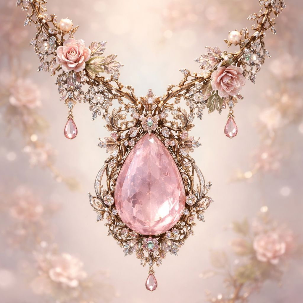 A beautiful soft coloured necklace with a light Victorian baby pink gem , nature_inspired style