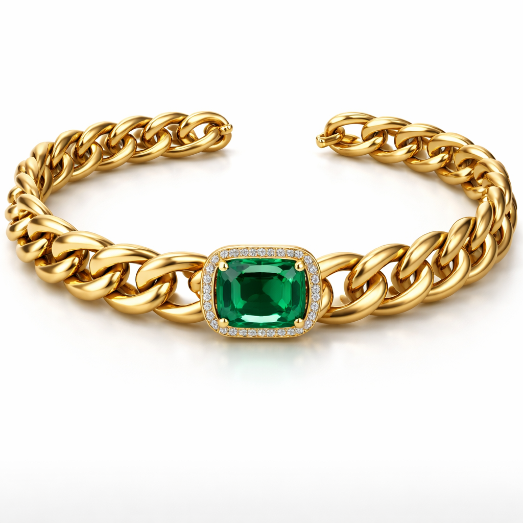 Create a luxury choker necklace design featuring a bold thick chain style in rich polished yellow gold. The necklace should sit elegantly around the neck as a statement choker, with a strong modern silhouette and premium craftsmanship. At the center of the necklace, place one striking emerald green gemstone as the focal point. The stone should be large, elegant, and luxurious—either emerald-cut or oval-cut—securely set in a refined gold setting that blends beautifully with the chain. Design direction: • Thick gold chain links, bold yet sophisticated • High-end luxury jewelry aesthetic • Modern glamour with timeless elegance • Statement piece suitable for evening wear or luxury fashion styling • Inspired by Cartier / Bvlgari / contemporary haute joaillerie Show as a photorealistic jewelry render on a clean white background, front angle and slight perspective, highly detailed gold texture, realistic gemstone brilliance, premium product presentation., minimalist style