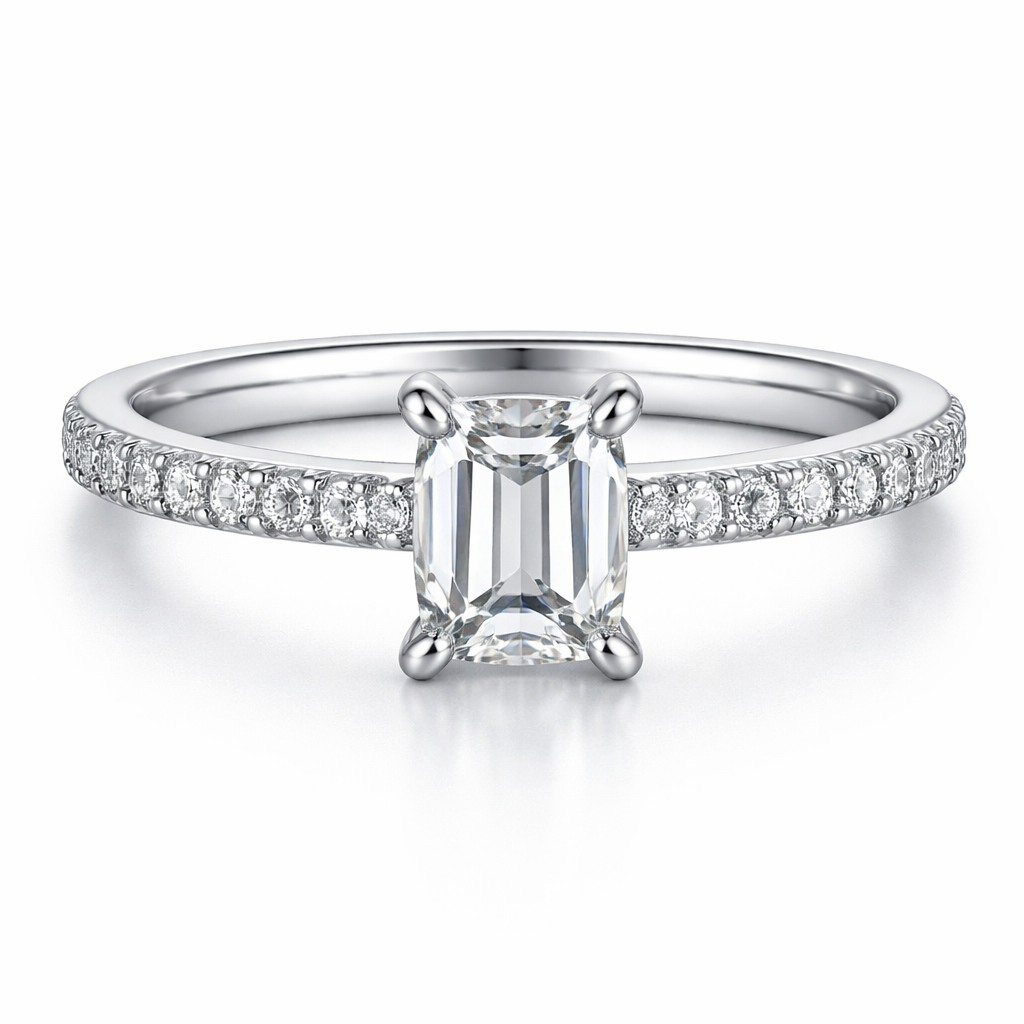 5x4mm emerald cut diamond engagement ring with small diamonds on the band