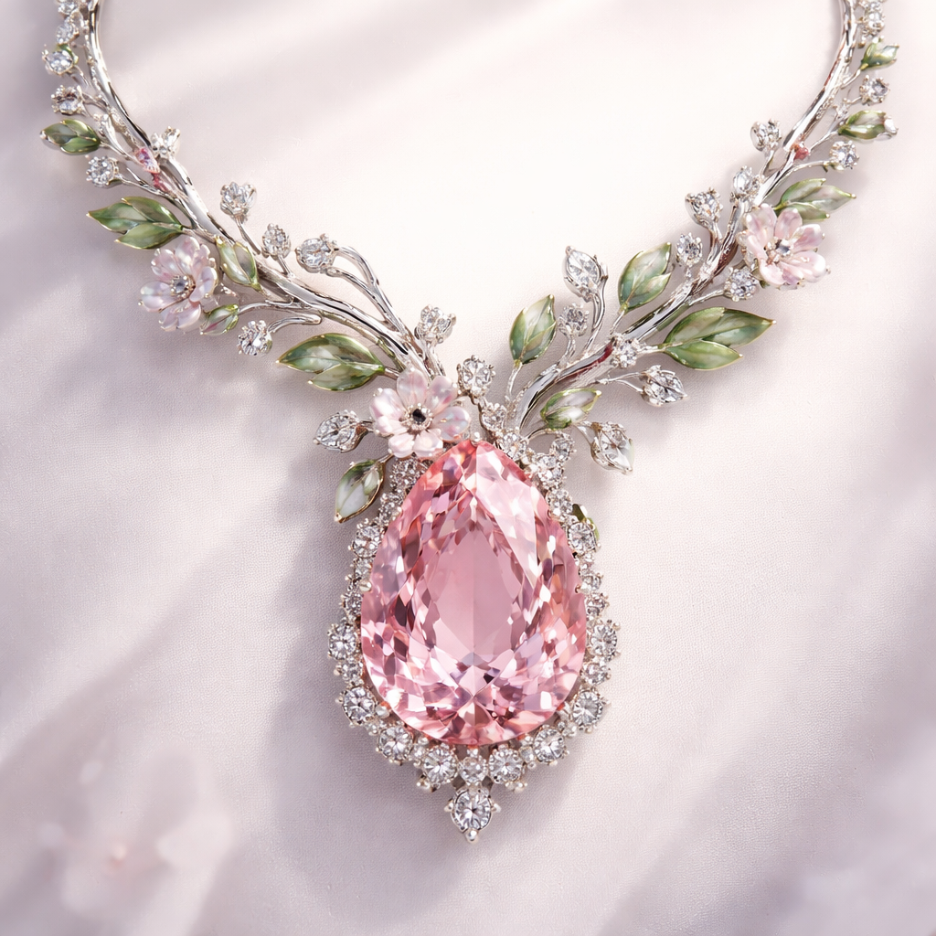 A beautiful necklace with a bit of a nature style and a vivid vintage baby pink gem, modern style