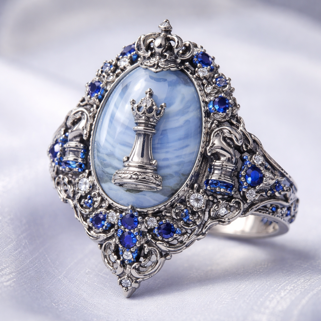 Make a blue lace agate chess themed ring with a royal blue. Make it the Ouji aesthetic, victorian style