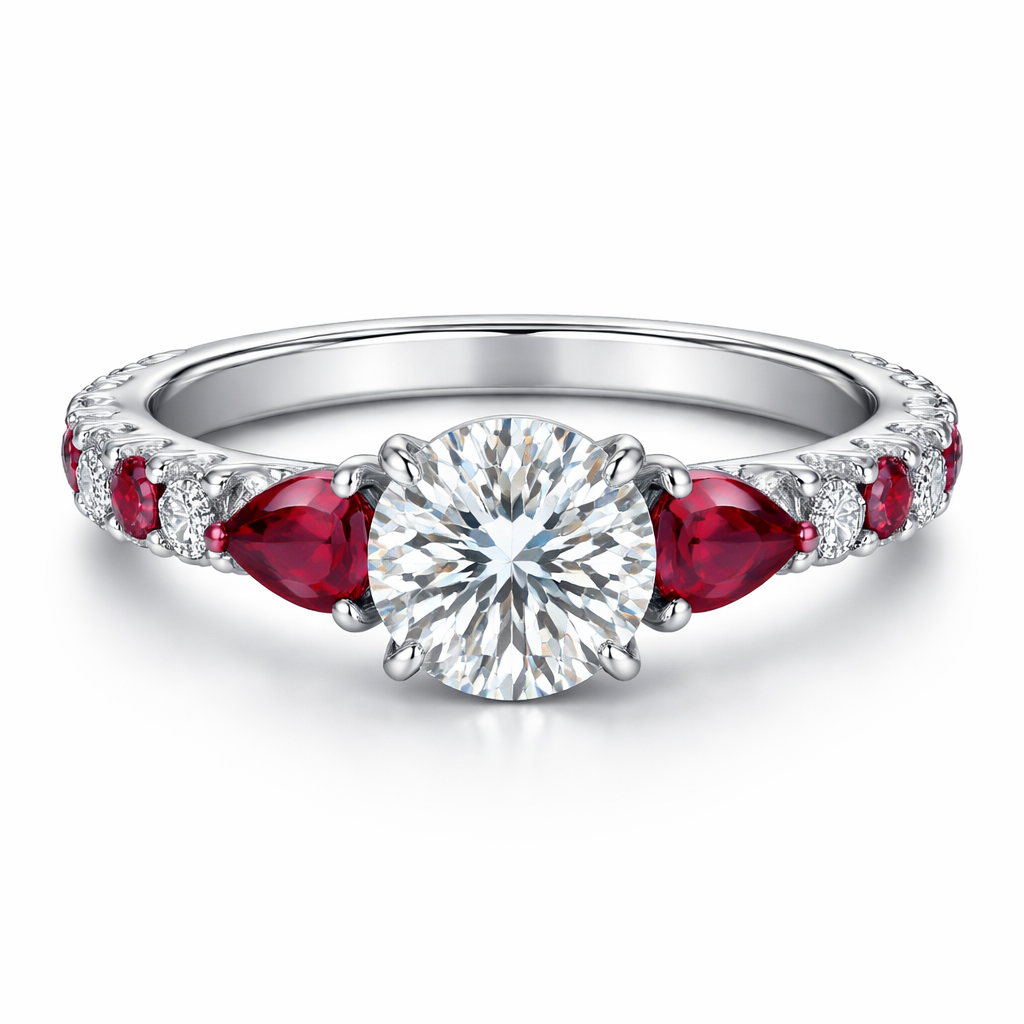 Engagement band with white diamond and red ruby diamond