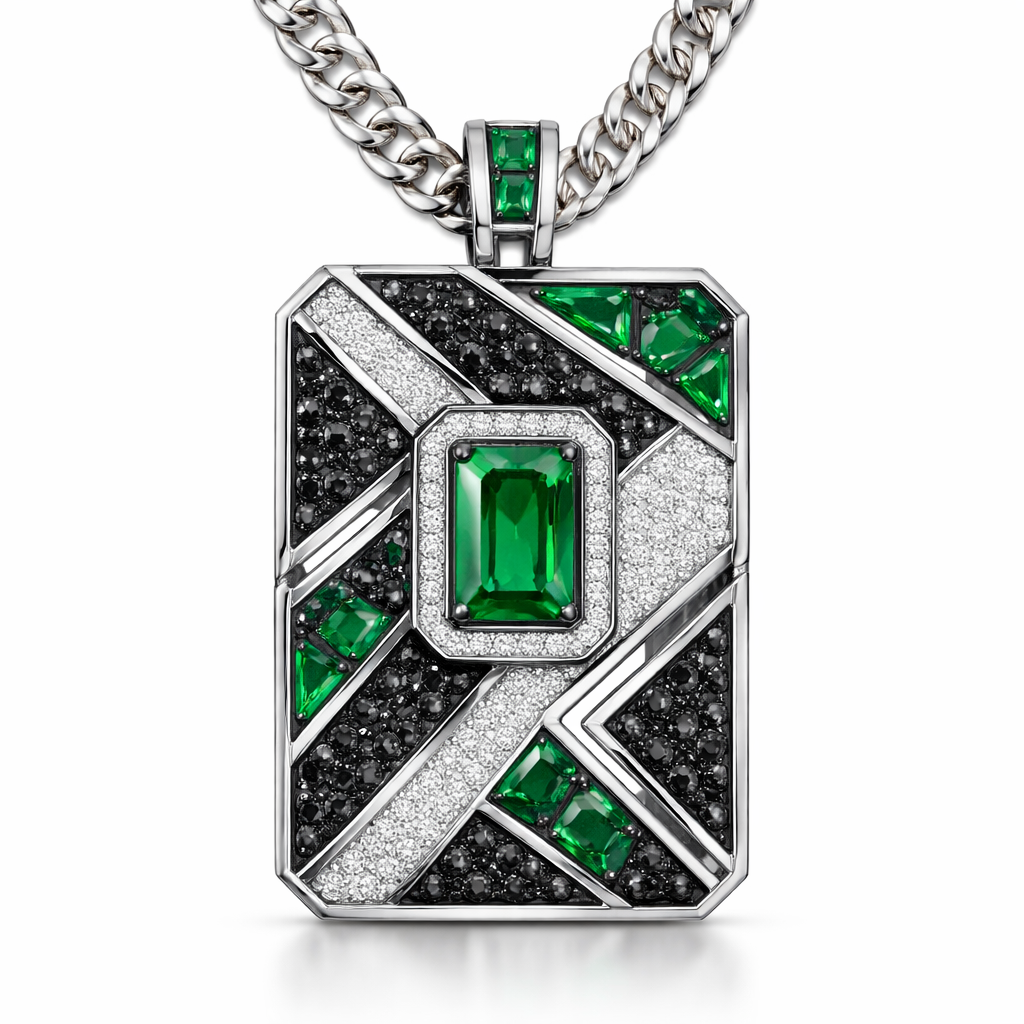 Geomatric angles  and edges pendant  and chainfor men of rectangular and sqaure shape of white and blcak diamonds and green of unique design and special shape
