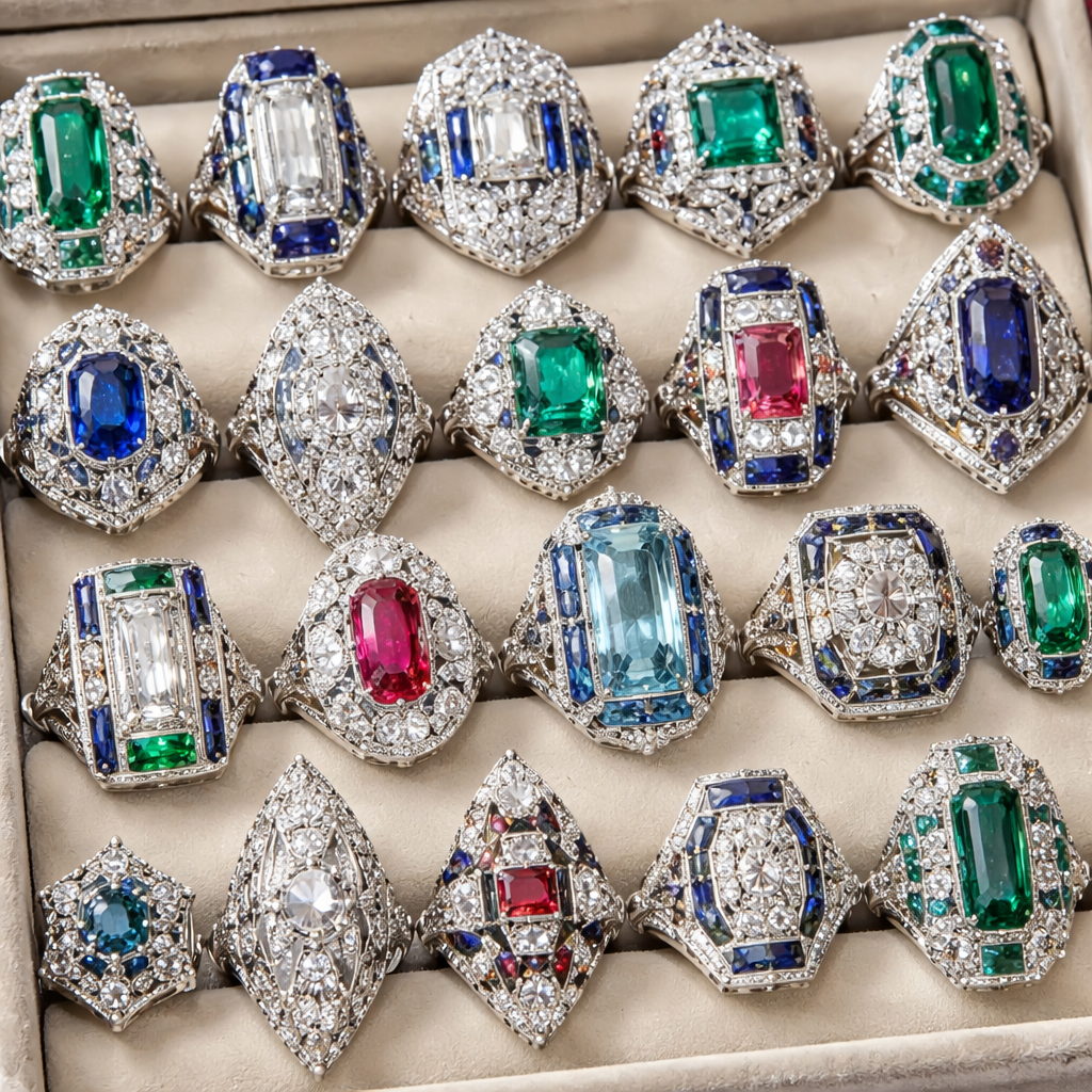 A ring collection with lots of rings in it, art_deco style
