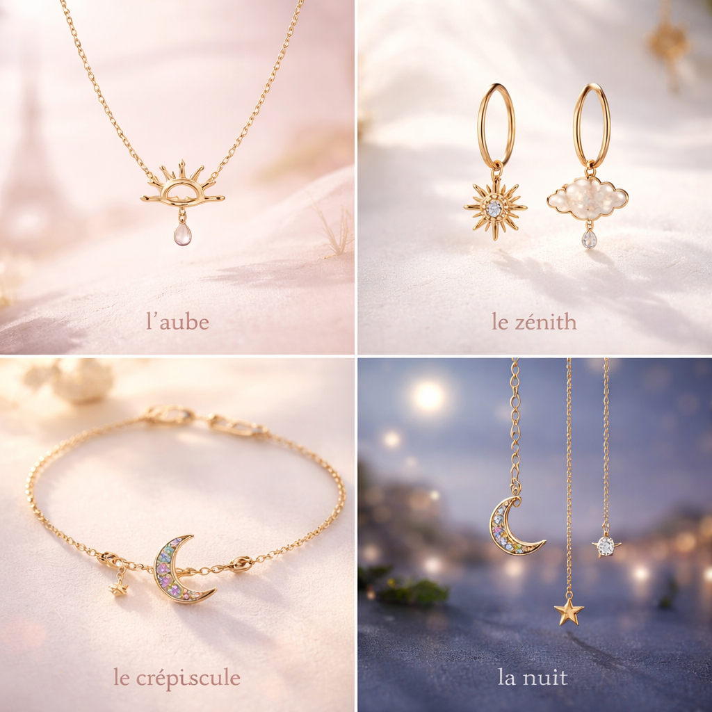 Crée une collection de bijoux ultra-fins, minimalistes, avec des motifs délicats, inspirés des phases de la journée à Paris. Chaque pièce doit être légère, fine, avec des détails subtils, capturant l’élégance discrète de l’aube, du zénith, du crépuscule et de la nuit.