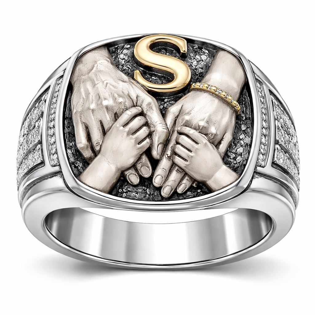A women's ring. Anillo para hombre con la mano de papa, mamá sujetandose y 2 manos pequeñas y una letra S atras, modern style