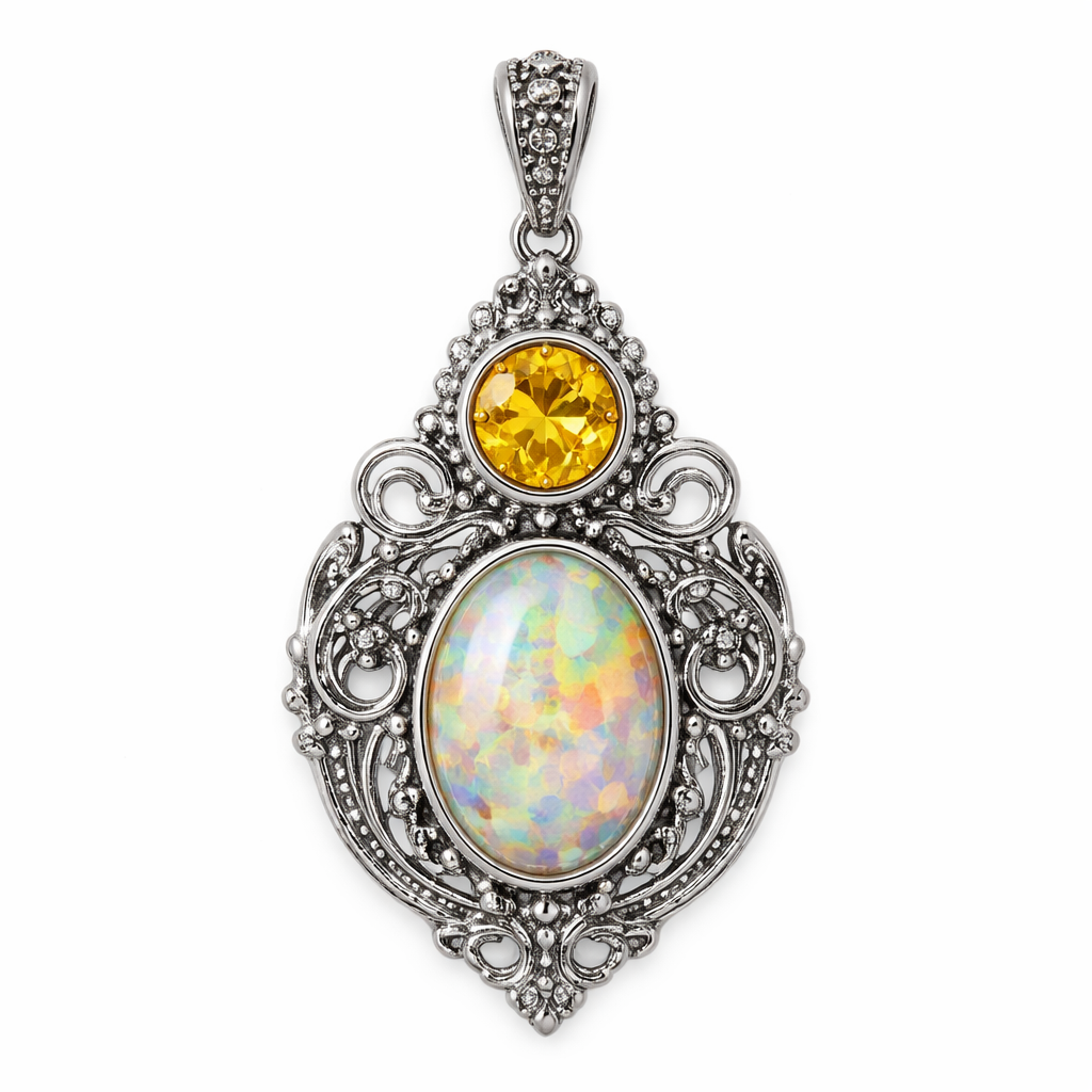 Round citrine and oval opal bezel set in a silver pendant, edwardian style